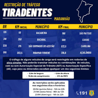 As restrições têm início nesta quinta-feira (20) e seguem até domingo (23), nos municípios de Bacabeira a São Mateus (BR-135), Bacabal a Caxias (BR-316), São Domingos do Azeitão a Carolina (BR-230) e Ribamar Fiquene a Açailândia (BR-010).